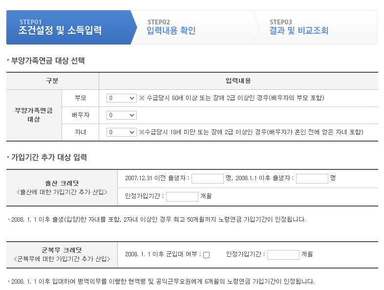 - 부양가족, 출산, 군복무 및 향후 나의 추정 소득 및 가입기간 등을 설정하여 입력해 주시면 국민연금 예상수령액을 확인해 보실 수 있습니다.