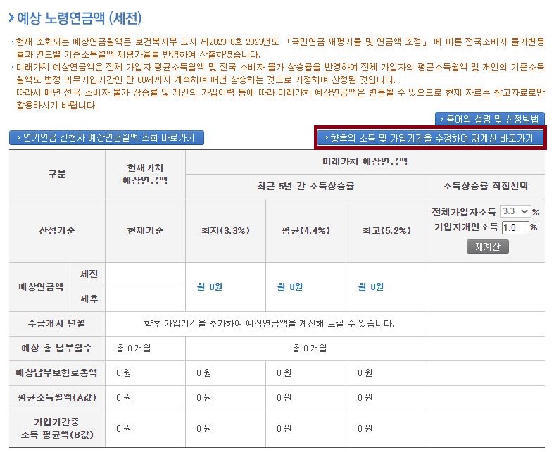 - 해당이 없는 경우 '향후 소득 및 가입기간을 수정하여 재계산 바로가기'를 클릭하시면 아래와 같은 화면이 나옵니다.