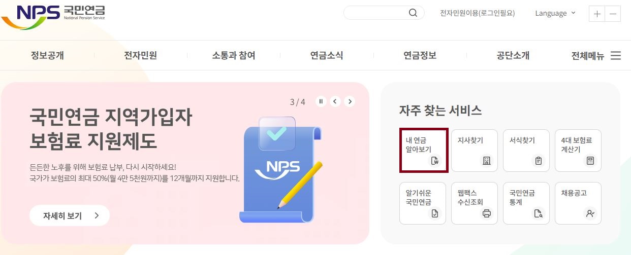 - 국민연금공단 - 자주 찾는 서비스 - 내 연금 알아보기 클릭