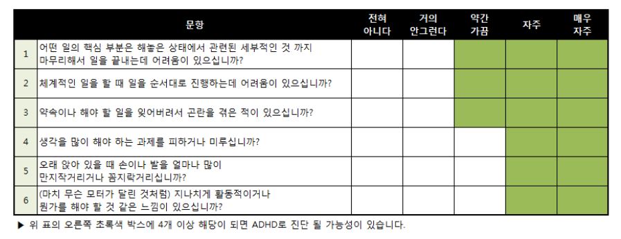 아래는 세계보건기구(WHO)에서 만든 성인 ADHD 자가 보고 척도(ASRS)입니다.